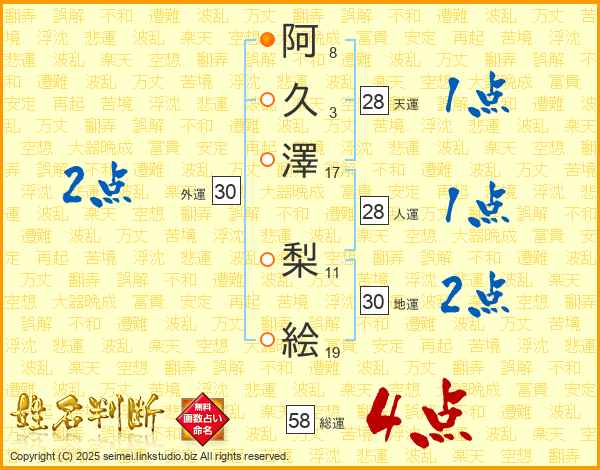 阿(8画)久(3画)澤(17画) 梨(11画)絵(19画)