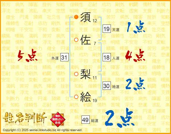 須(12画)佐(7画) 梨(11画)絵(19画)