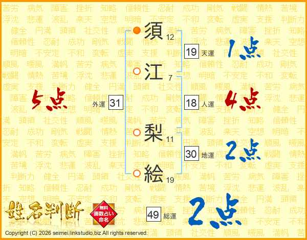 須(12画)江(7画) 梨(11画)絵(19画)