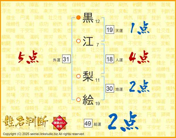 黒(12画)江(7画) 梨(11画)絵(19画)