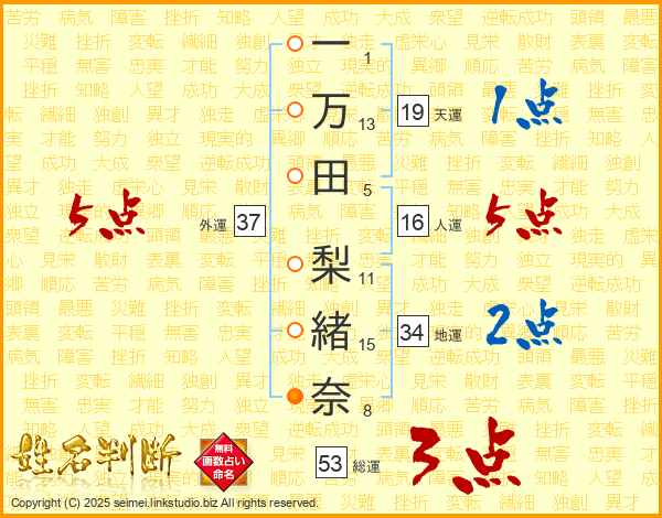 一(1画)万(13画)田(5画) 梨(11画)緒(15画)奈(8画)