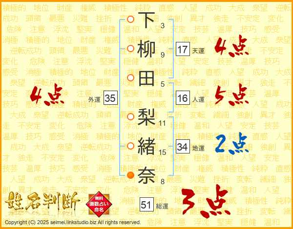 下(3画)柳(9画)田(5画) 梨(11画)緒(15画)奈(8画)
