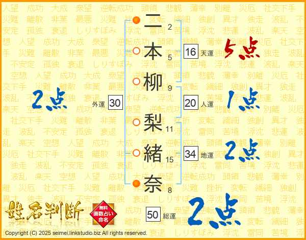 二(2画)本(5画)柳(9画) 梨(11画)緒(15画)奈(8画)