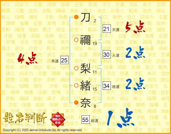 刀禰梨緒奈さんの総運は55画の1点!