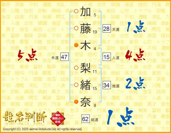 加(5画)藤(19画)木(4画) 梨(11画)緒(15画)奈(8画)