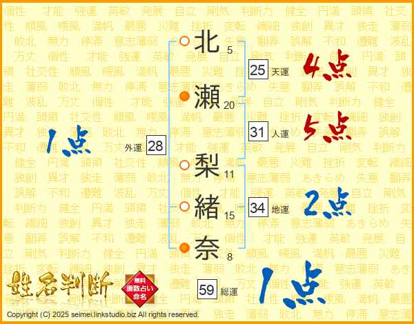 北(5画)瀬(20画) 梨(11画)緒(15画)奈(8画)
