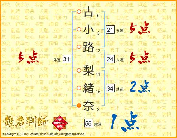 古(5画)小(3画)路(13画) 梨(11画)緒(15画)奈(8画)