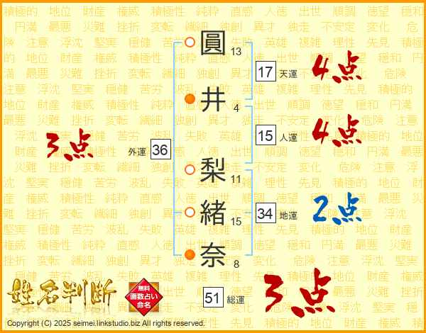 圓(13画)井(4画) 梨(11画)緒(15画)奈(8画)