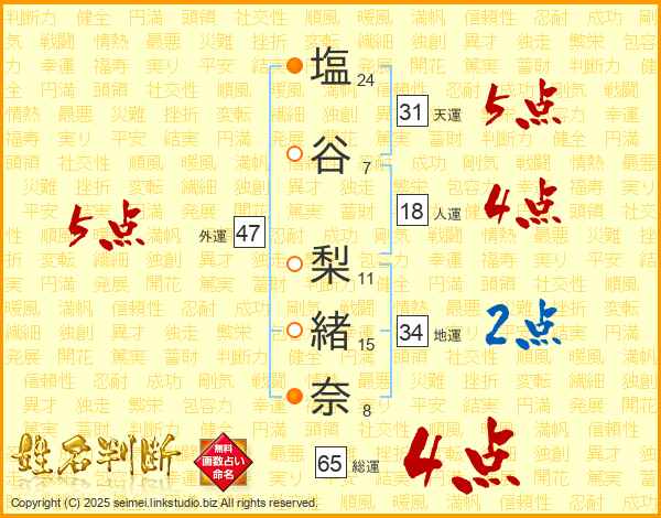塩(24画)谷(7画) 梨(11画)緒(15画)奈(8画)