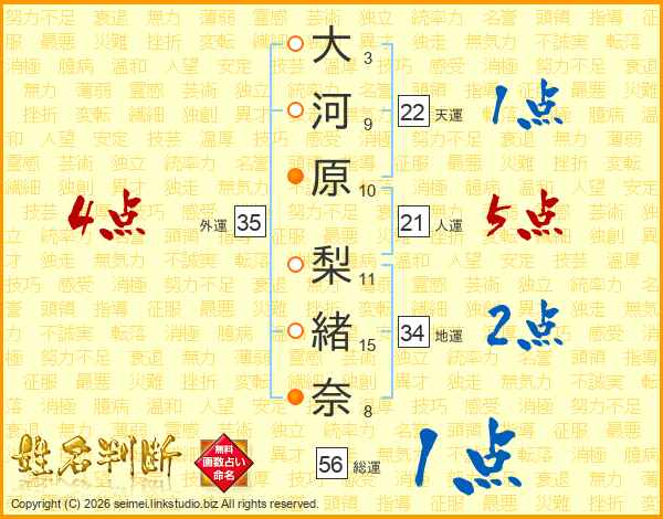 大(3画)河(9画)原(10画) 梨(11画)緒(15画)奈(8画)