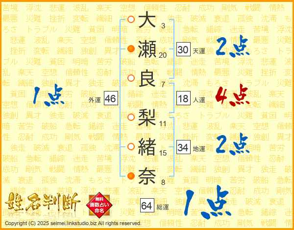 大(3画)瀬(20画)良(7画) 梨(11画)緒(15画)奈(8画)