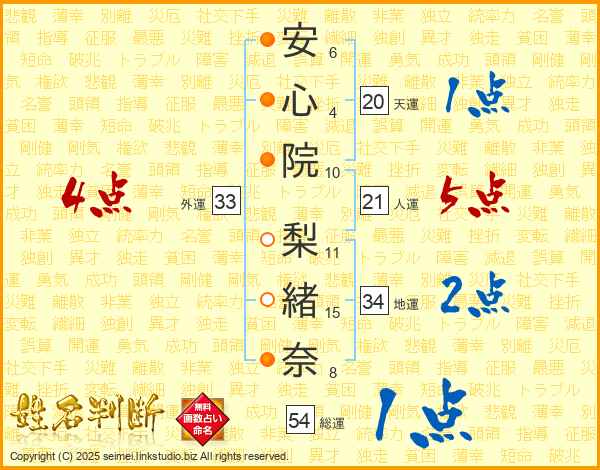 安(6画)心(4画)院(10画) 梨(11画)緒(15画)奈(8画)