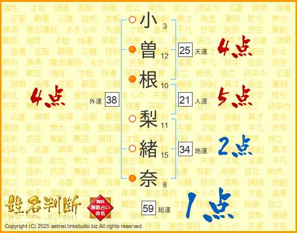 小(3画)曽(12画)根(10画) 梨(11画)緒(15画)奈(8画)