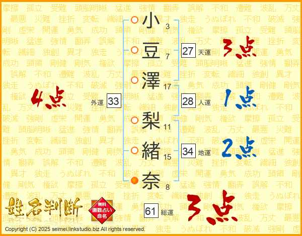 小(3画)豆(7画)澤(17画) 梨(11画)緒(15画)奈(8画)