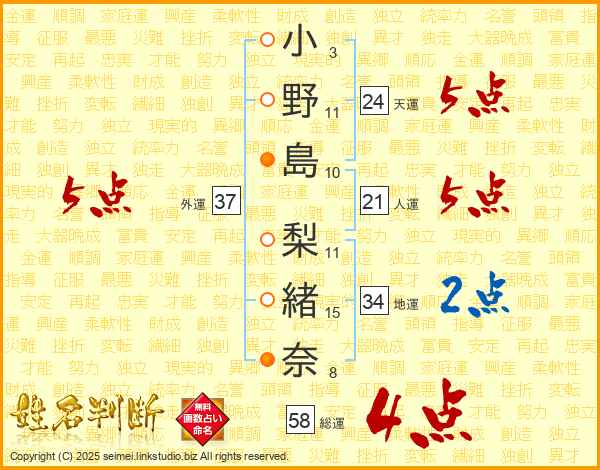 小(3画)野(11画)島(10画) 梨(11画)緒(15画)奈(8画)