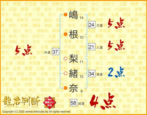 嶋(14画)根(10画) 梨(11画)緒(15画)奈(8画)
