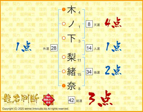 木(4画)ノ(1画)下(3画) 梨(11画)緒(15画)奈(8画)