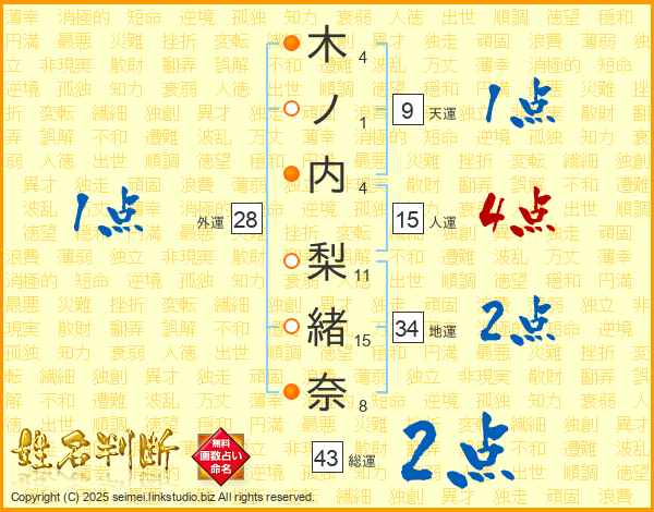 木(4画)ノ(1画)内(4画) 梨(11画)緒(15画)奈(8画)