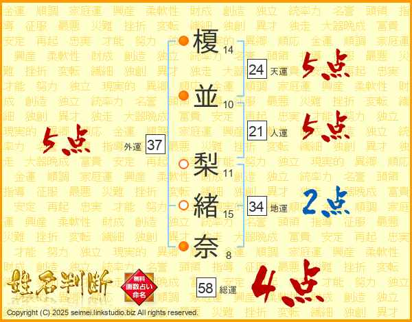 榎(14画)並(10画) 梨(11画)緒(15画)奈(8画)