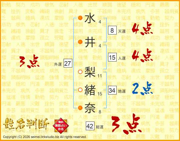 水(4画)井(4画) 梨(11画)緒(15画)奈(8画)