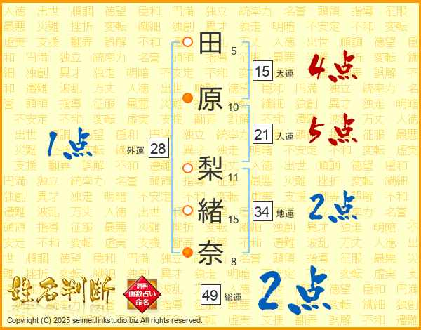 田(5画)原(10画) 梨(11画)緒(15画)奈(8画)