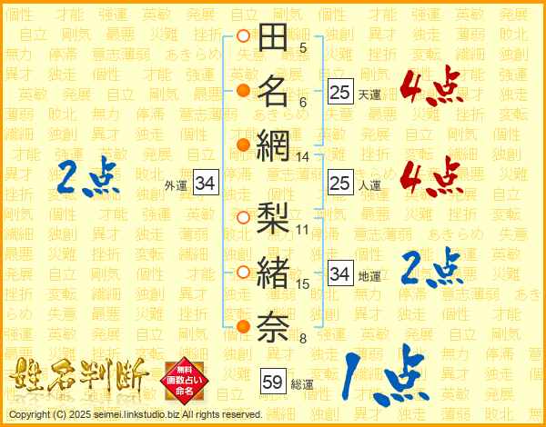 田(5画)名(6画)網(14画) 梨(11画)緒(15画)奈(8画)