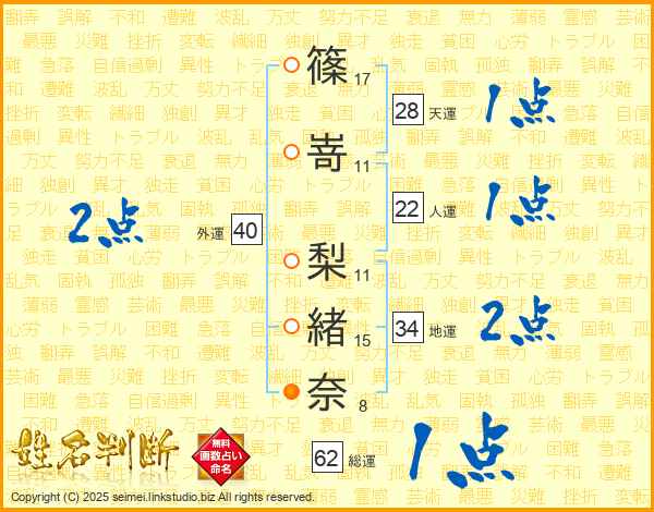 篠(17画)嵜(11画) 梨(11画)緒(15画)奈(8画)