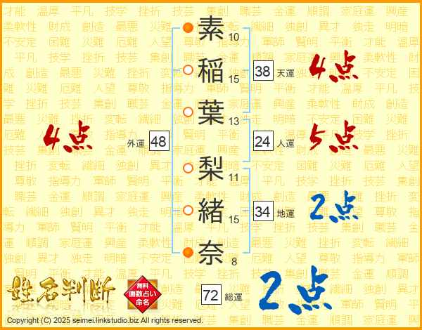 素稲葉梨緒奈さんの総運は72画の2点!