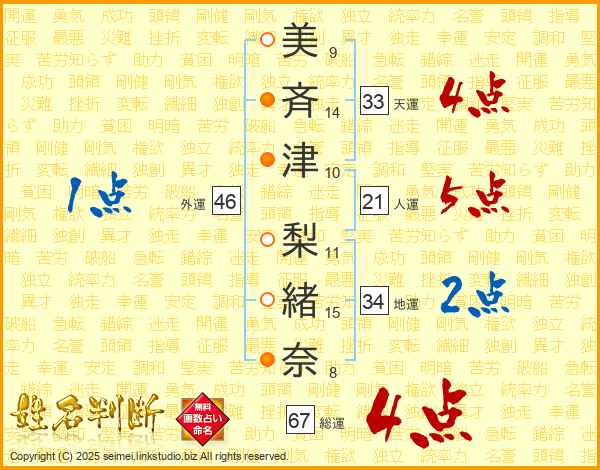 美(9画)斉(14画)津(10画) 梨(11画)緒(15画)奈(8画)