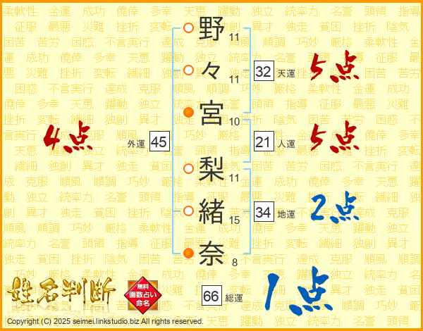 野(11画)々(11画)宮(10画) 梨(11画)緒(15画)奈(8画)
