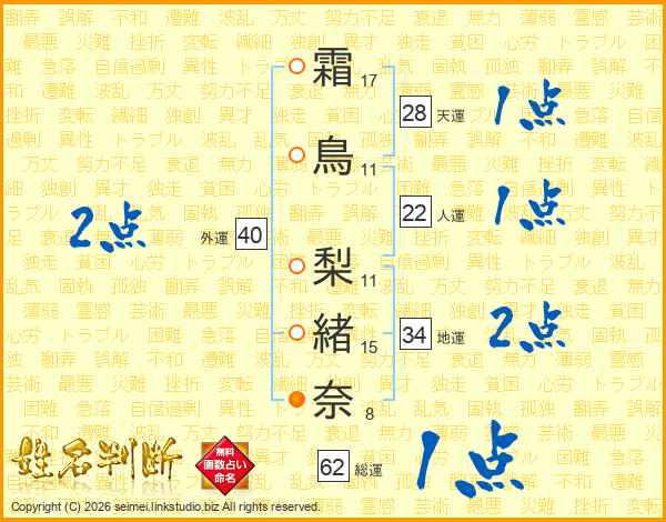 霜(17画)鳥(11画) 梨(11画)緒(15画)奈(8画)