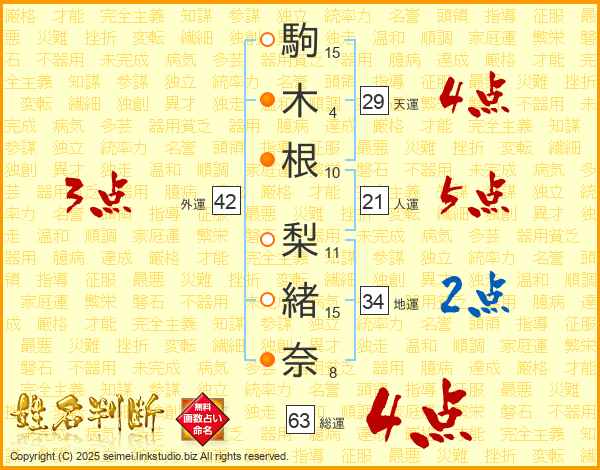 駒(15画)木(4画)根(10画) 梨(11画)緒(15画)奈(8画)