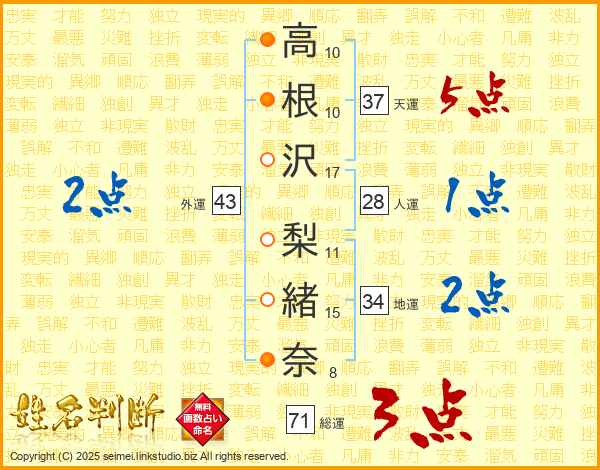 高(10画)根(10画)沢(17画) 梨(11画)緒(15画)奈(8画)