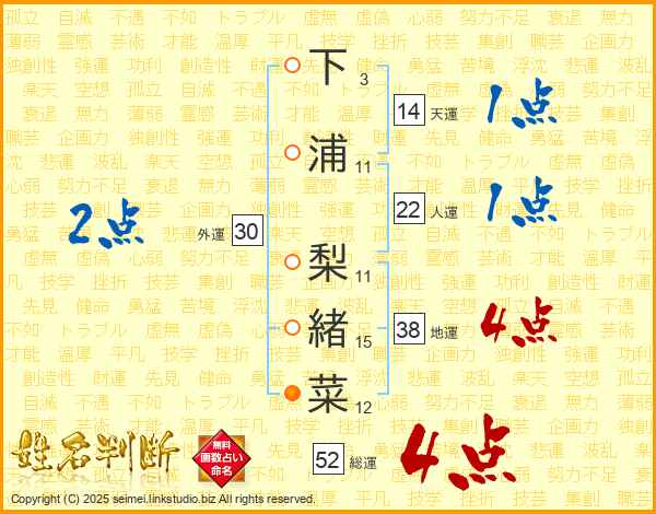下浦梨緒菜さんの総運は52画の4点!