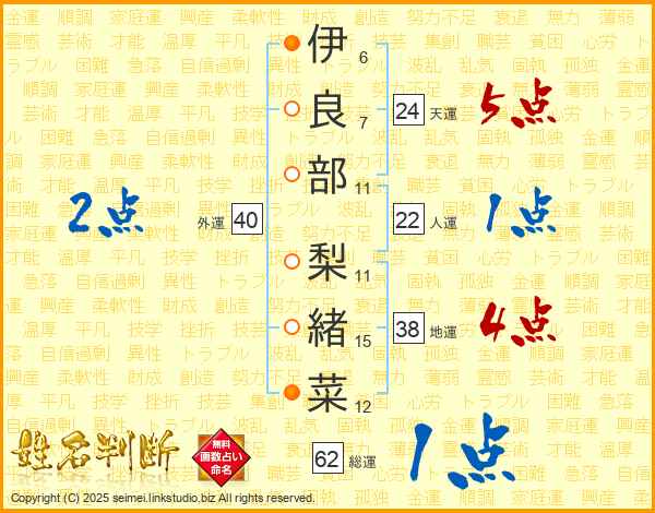伊(6画)良(7画)部(11画) 梨(11画)緒(15画)菜(12画)