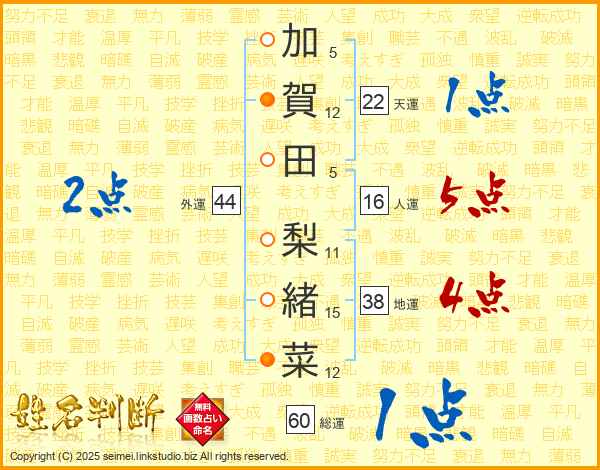 加(5画)賀(12画)田(5画) 梨(11画)緒(15画)菜(12画)