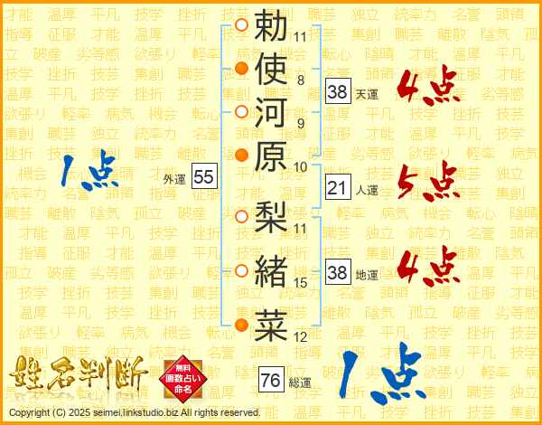 勅(11画)使(8画)河(9画)原(10画) 梨(11画)緒(15画)菜(12画)