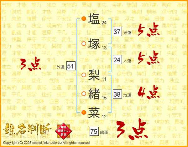 塩(24画)塚(13画) 梨(11画)緒(15画)菜(12画)