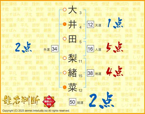 大(3画)井(4画)田(5画) 梨(11画)緒(15画)菜(12画)