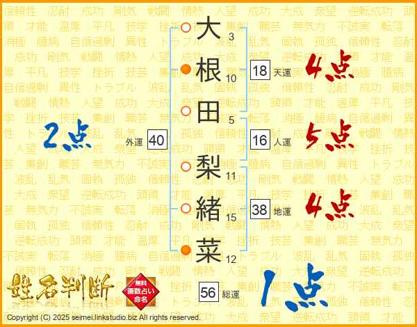 大(3画)根(10画)田(5画) 梨(11画)緒(15画)菜(12画)