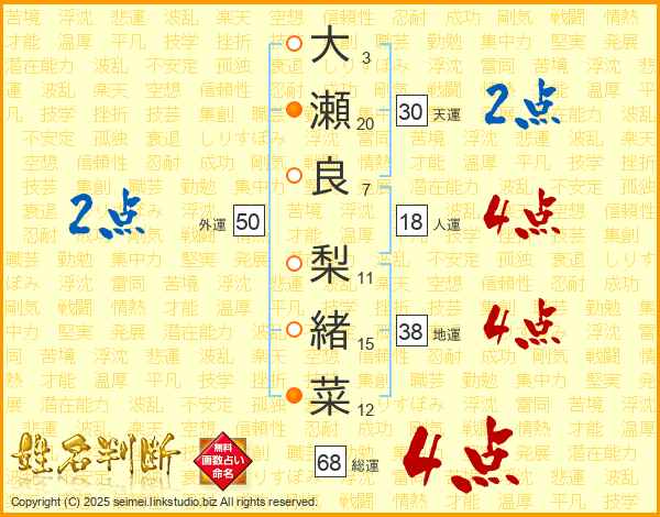 大(3画)瀬(20画)良(7画) 梨(11画)緒(15画)菜(12画)
