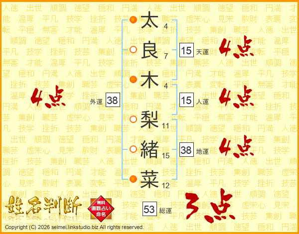 太良木梨緒菜さんの外運は38画の4点!