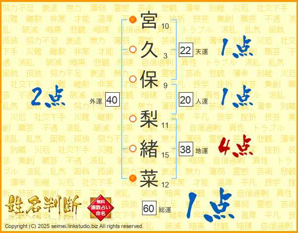 宮(10画)久(3画)保(9画) 梨(11画)緒(15画)菜(12画)