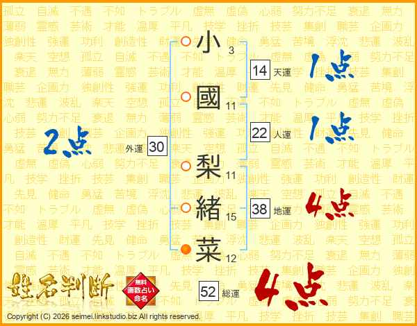 小(3画)國(11画) 梨(11画)緒(15画)菜(12画)