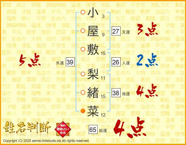 小(3画)屋(9画)敷(15画) 梨(11画)緒(15画)菜(12画)