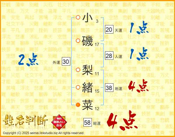 小(3画)磯(17画) 梨(11画)緒(15画)菜(12画)