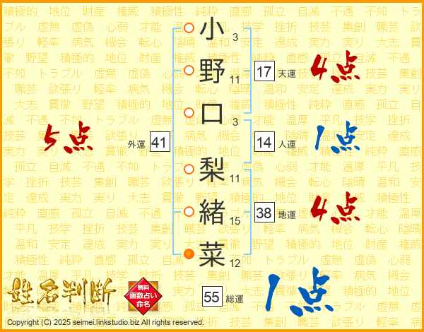 小(3画)野(11画)口(3画) 梨(11画)緒(15画)菜(12画)