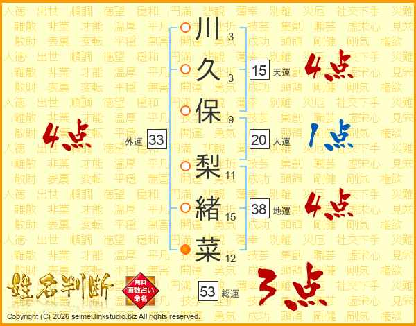 川(3画)久(3画)保(9画) 梨(11画)緒(15画)菜(12画)
