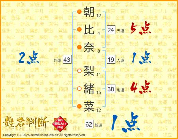 朝(12画)比(4画)奈(8画) 梨(11画)緒(15画)菜(12画)