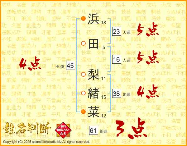 浜田梨緒菜さんの天運は23画の5点!